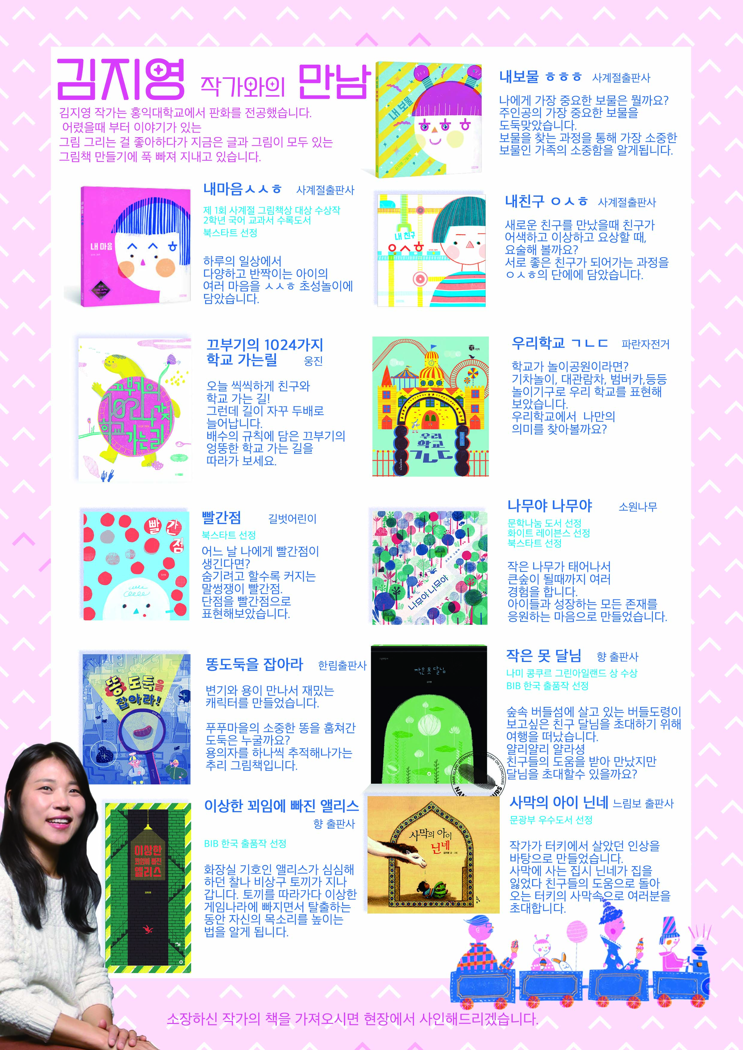 [도서관주간] 김지영 작가 강연 (「나무야 나무야」- 숲이 될 너에게) 강연주제『나무야 나무야』-숲이 될 너에게 운영일시 2026. 4. 13. (월) 16:00~17:30 신청기간 2026. 3. 31. (화) 10:00 ~ 마감 시까지 운영장소 화도도서관 4층 문화강연실 모집대상 초등 1~2학년 20명 운영내용 - 주제도서 : 그림책 「나무야 나무야」 - 그림책 속 나무의 성장 이야기를 통해 자신과 주변이 서로 연결된 존재임을 이해하기 - 판화 체험 활동을 통해 자신만의 이야기를 예술로 표현하는 즐거움 경험하기 유의사항 - 강연에 대한 자세한 내용은 첨부파일의 강의계획서 참고하여 주시기 바랍니다. - 주차공간이 없으므로 도보/대중교통 또는 인근의 공영주차장을 이용하여 주시기 바랍니다. - 신청은 참여하는 참여자의 성명/생년월일로 기재하여 신청바랍니다. - 참여 가능하신 분들만 신청주시기 바라며, 무단 불참 및 당일취소 시 다음 행사 신청이 불가합니다. (작가소개) - 작가 대표 저서 : 「내 마음 ㅅㅅㅎ」,「내 친구 ㅇㅅㅎ」, 「빨간 점」등 ![]() |